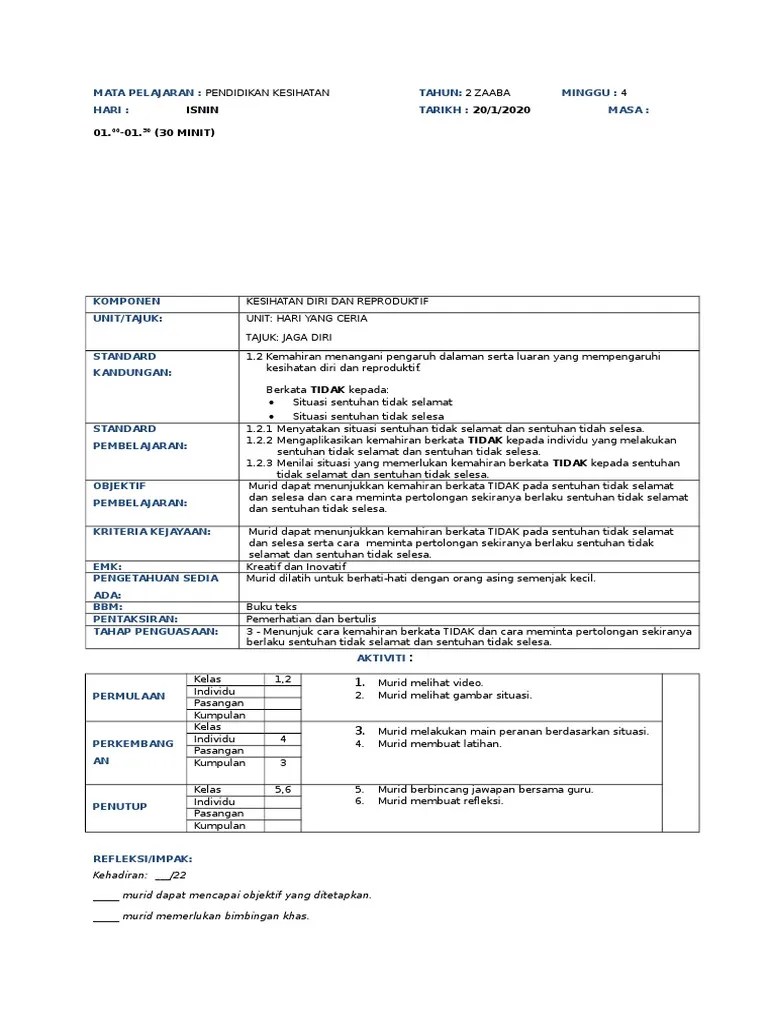 Latihan Pendidikan Kesihatan Tahun 2 Hari Yang Ceria : Contoh Rph Ts25 Pk Tahun 2 Unit 9 Hari Yang Ceria Jauhkan Diri Pdf